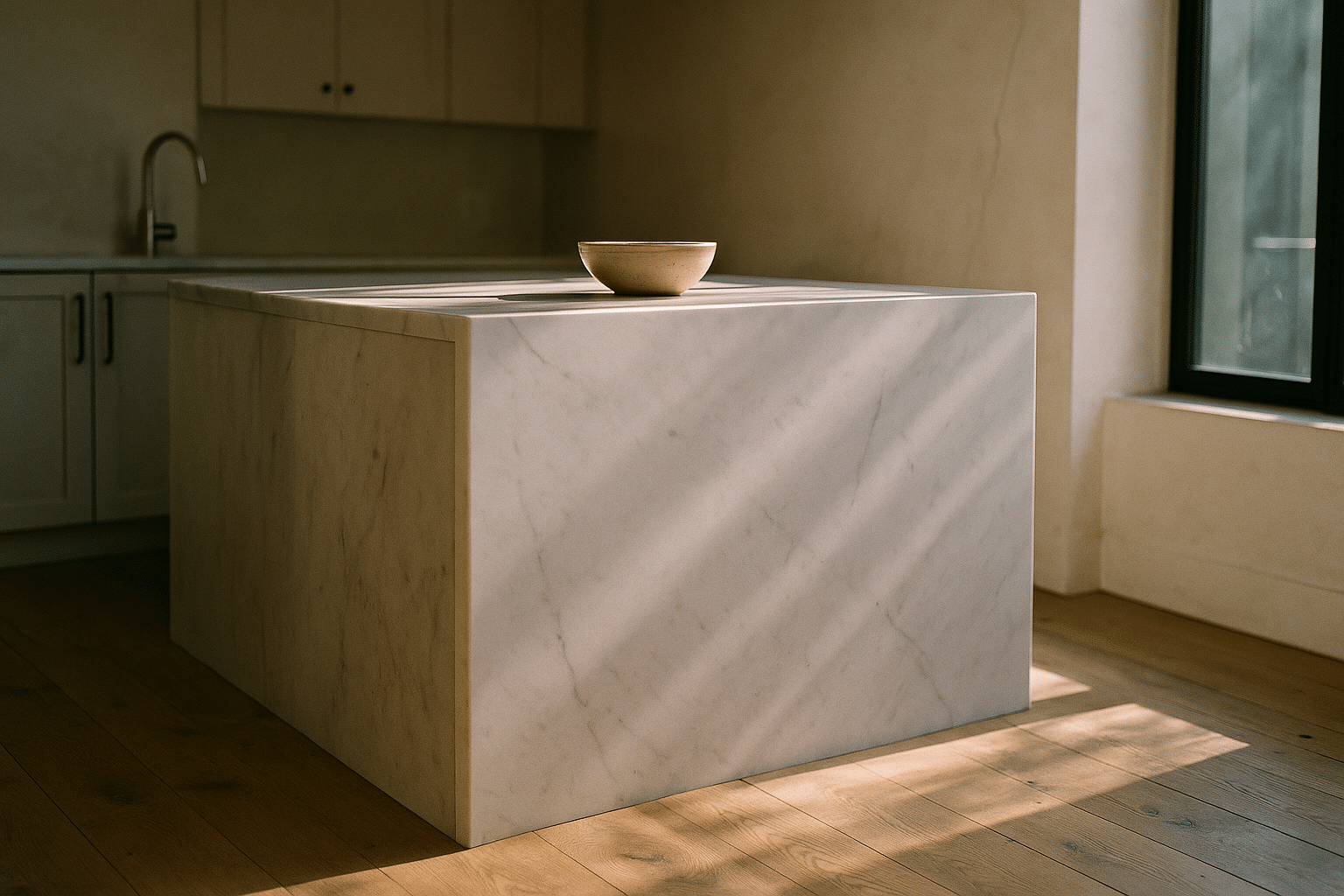 Watch-outs include the potential for visible wear at outward corners and the need for precise templating. On the upside, the design can make compact kitchens feel coherent by simplifying lines. Pair with simple cabinetry and restrained hardware so the island leads with its material story, not ornament. The result is a kitchen that feels composed—calm on busy days and dramatic when the house is quiet.